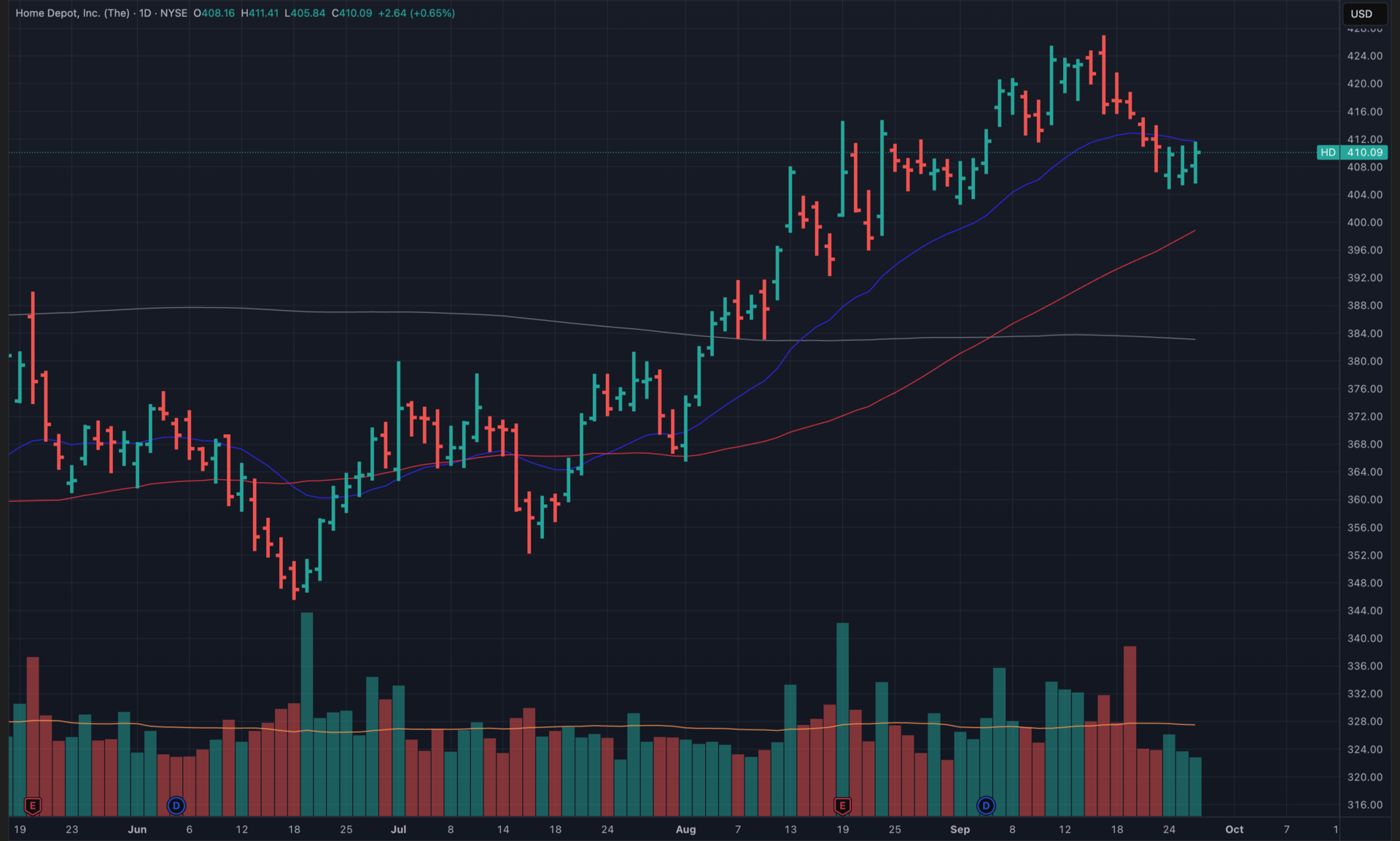 After sprinting to $425, HD has drifted back toward its 20-day and 50-day moving averages—a classic, normal mean-reversion move that speaks to both solid execution and the broader resilience of U.S. demand. The $400–$410 range now shapes up as the near-term battleground where the 20-day and 50-day moving averages converge, a zone likely to magnetize order flow as institutional participation increases and consumer discretionary sector leadership cools into the end of the year. A clean hold above this area would keep the uptrend intact, while a decisive break below the 50-day moving average raises the odds of a range-bound period of trading as the stock digests gains.